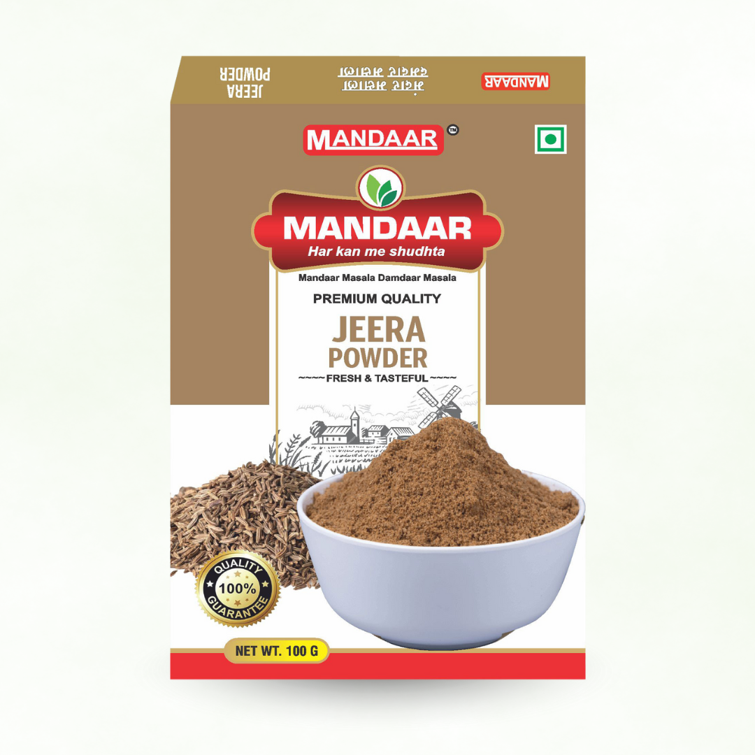 Mandaar Jeera Powder is made from premium-quality cumin seeds, finely ground to deliver a warm, earthy flavor and rich aroma that enhances every Indian dish.